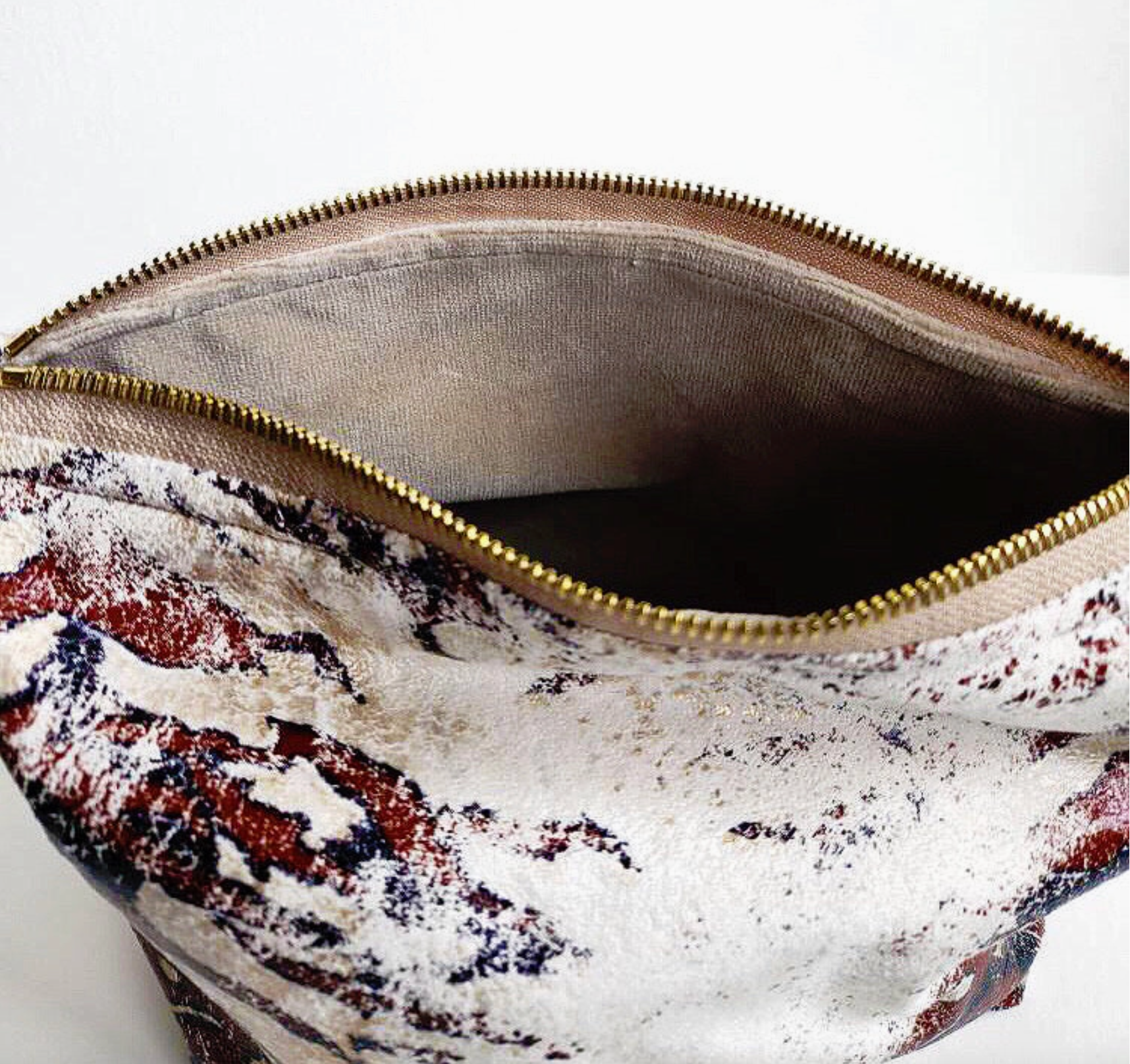 Beautiful cream and gold bengal fabric. Fully lined with grey plush velvet. This is the perfect size for all of your cosmetic and travel needs. * Velvet Lining * Dimensions Approximately 6" H x 10.75 W x 5" D * Metal Zipper closure * Made in the USA